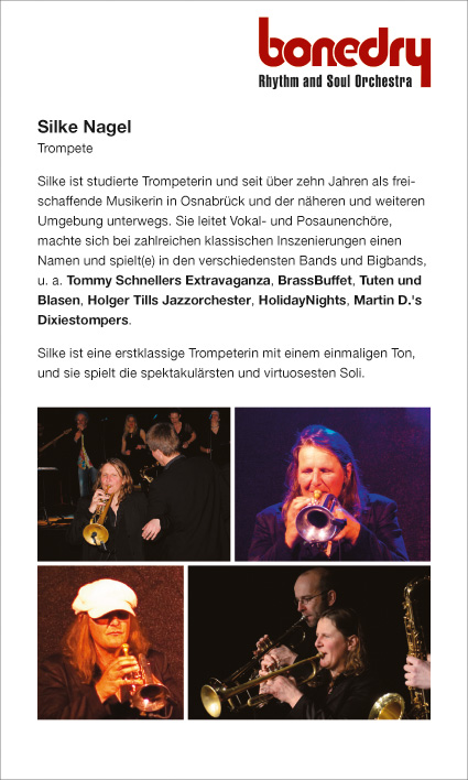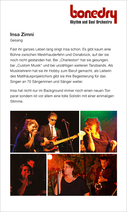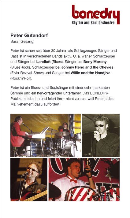 Eigentlich sollte es an jenem dunklen Herbstabend im Jahr 1998 nur eine einmalige Spaßprobe von fünf Kollegen sein, doch es kam ganz anders. Es war die Geburtsstunde von BONEDRY, einer kleinen Soulband, die schon bald zu einem neunköpfigen "Rhythm and Soul Orchestra" wuchs. Viel Groove, knackiges Gebläse, souliger Gesang, verrücktes Entertainment und jede Menge Show - dafür stand BONEDRY vom ersten Moment an.