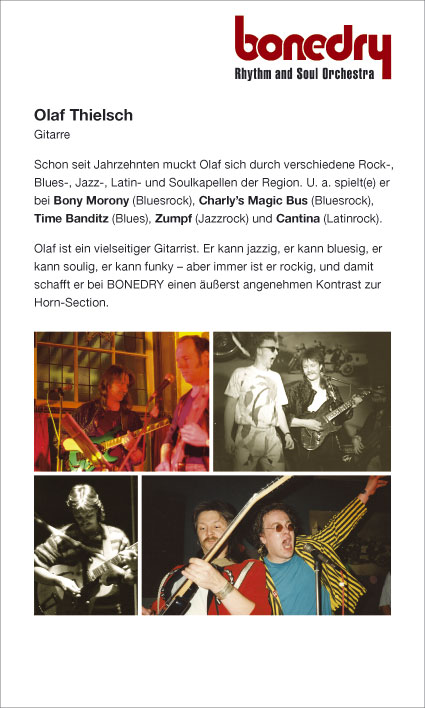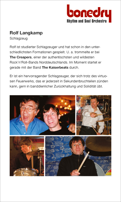 Von Köln bis zur Nordseeküste war das BONEDRY Rhythm and Soul Orchestra auf zahlreichen Stadtfesten, in vielen Clubs, in Zelten und Hallen zu erleben. Mehr als zehn Jahre lang war BONEDRY ausschließlich auf der Bühne tätig, bis 2010 - nicht zuletzt auf Drängen des Publikums - endlich die erste BONEDRY-CD mit dem Titel "Bumpin into Mr. B." aufgenommen wurde, die trotz nüchterner Studio-Atmosphäre so viel Live-Feeling in sich hat, dass sie auch gern als "BONEDRY-Show to go" bezeichnet wird. BONEDRY ist durch und durch eine Live-Band, auch im Studio - am liebsten aber auf der Bühne.
