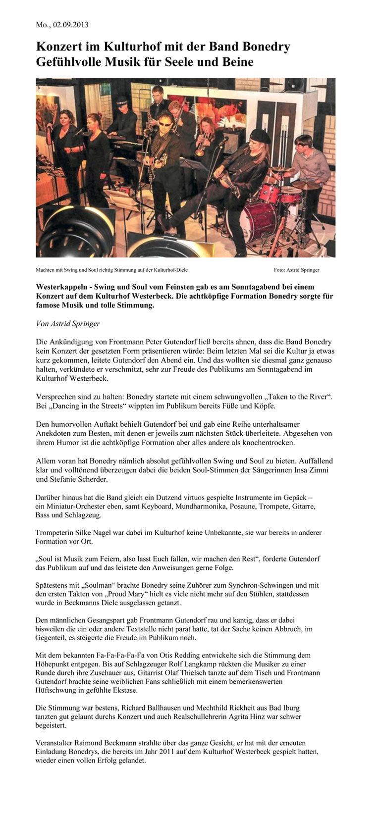 Konzert auf dem Kulturhof Westerbeck in Westerkappeln am 1. September 2013 (Westfälische Nachrichten und Neue Osnabrücker Zeitung) |